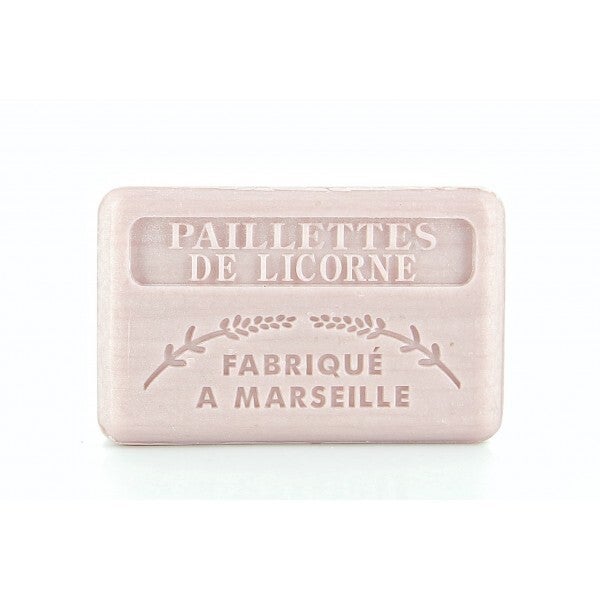 Ontdek de Savon de Marseille Unicorn Glitter Zeep , Artisanale zeep verrijkt met biologische sheaboter met wat glitters en een bloemige geur van monoi met een zoete en pittige toets. 4 Oz.