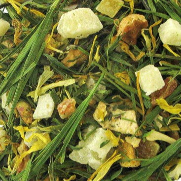Ingrediënten: ananas (ananas, suiker, citroenzuur), appel, papaya (papaya, suiker, citroenzuur), witte thee, bamboeblad, aroma, goudsbloembloesem