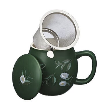 Porseleinen theemok met exclusief La Via del Tè bloempatroon (350 cc) met deksel en roestvrijstalen zeef Forest Groen, ideaal om snel je favoriete thee te bereiden.