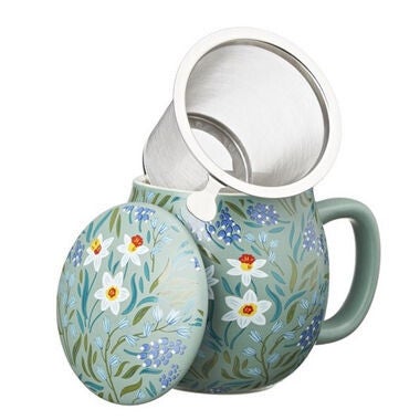 Porseleinen theemok met exclusief La Via del Tè Bloom bloemenpatroon in Celadon Groen (350 cc) met deksel en roestvrijstalen zeef, ideaal om snel je favoriete thee te bereiden.