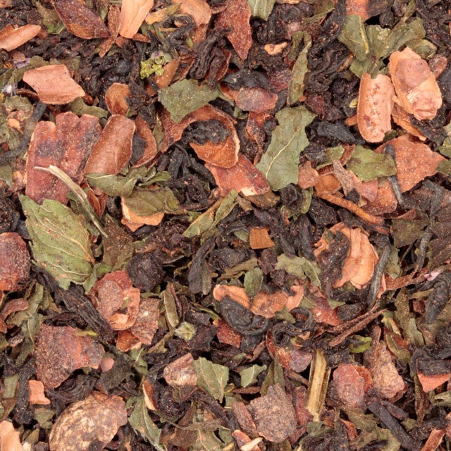 Ingrediënten: zwarte thee*, cacaodoppen*, pepermunt*